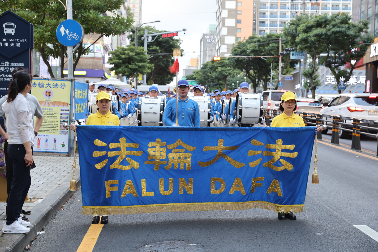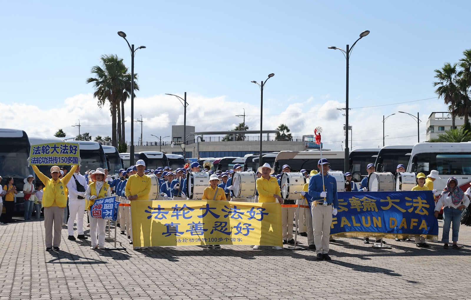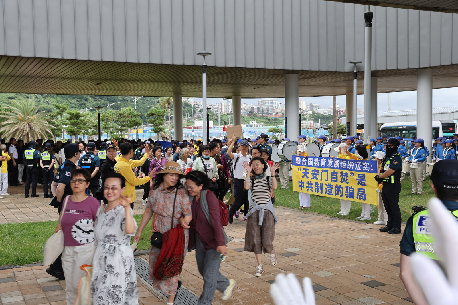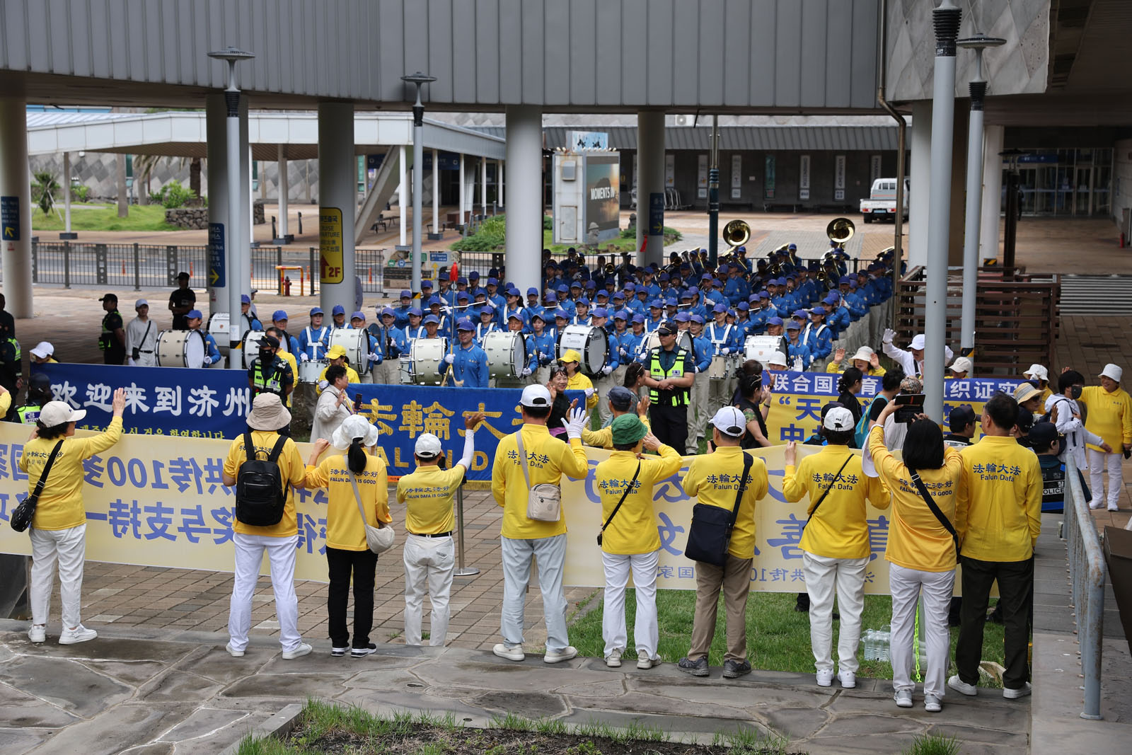 ผู้ฝึกมาที่ท่าเรือเชจู พร้อมกับถือป้ายผ้า "ยินดีต้อนรับสู่เชจู !" เพื่อทักทายนักท่องเที่ยวด้วยรอยยิ้ม เมื่อนักท่องเที่ยวกลุ่มแรกลงจากเรือสําราญ วงโยธวาทิตเทียนกั๋วก็บรรเลงเพลง "ฝ่าหลุนต้าฝ่าดี (Falun Dafa Is Good)" นักท่องเที่ยวหลายคนทักทายผู้ฝึกด้วยรอยยิ้ม และบางคนถ่ายรูปหรือบันทึกวิดีโอการแสดงและป้ายผ้า