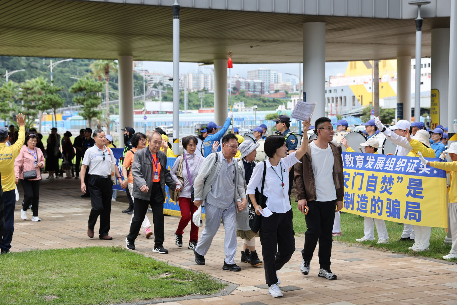 ในวันที่ 20 กันยายน หลังจากเรือสําราญ Dream ที่บรรทุกผู้โดยสาร 2,222 คนจากเทียนจินมาถึงที่เวลา 11:00 น. นักท่องเที่ยวก็ได้มารวมตัวกันที่บริเวณทางออกของอาคารผู้โดยสาร และเดินตามมัคคุเทศก์ไปขึ้นรถบัสที่ลานจอดรถ ขณะที่พวกเขากำลังรออยู่ในแถว ผู้ฝึกก็มีโอกาสบอกพวกเขาเกี่ยวกับฝ่าหลุนต้าฝ่า