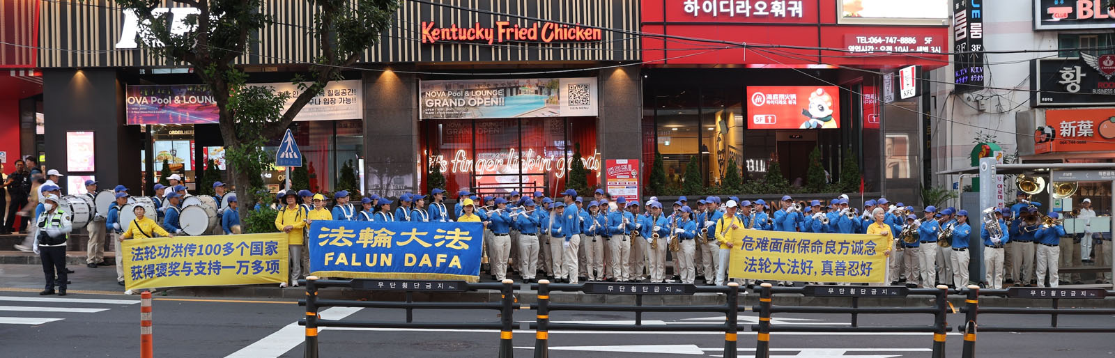 (Minghui.org) เกาะเชจูเป็นเกาะที่ใหญ่ที่สุดในเกาหลีใต้ และเป็นสถานที่ท่องเที่ยวยอดนิยมสําหรับชาวจีนเนื่องจากนโยบายยกเว้นวีซ่าและมีเที่ยวบินตรง ผู้ฝึกฝ่าหลุนต้าฝ่าแสดงป้ายผ้า แจกเอกสารข้อมูล และวงโยธวาทิตเทียนกั๋วบรรเลงเพลง เพื่อช่วยให้นักท่องเที่ยวชาวจีนเรียนรู้เกี่ยวกับฝ่าหลุนต้าฝ่าและหลุดพ้นจากการโฆษณาชวนเชื่อที่บิดเบือนข้อมูลเพื่อใส่ร้ายของพรรคคอมมิวนิสต์จีน