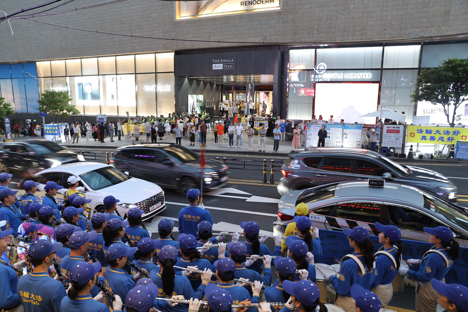 ที่ร้านปลอดภาษี Shilla นักท่องเที่ยวชาวจีนจํานวนมากได้ยินเสียงดนตรีที่วงโยธวาทิตเทียนกั๋วบรรเลง และอ่านโปสเตอร์ บางคนพูดคุยกับผู้ฝึกฝ่าหลุนต้าฝ่า ได้เรียนรู้ความจริงเกี่ยวกับฝ่าหลุนต้าฝ่า และตัดสินใจลาออกจากองค์กรพรรคคอมมิวนิสต์จีน